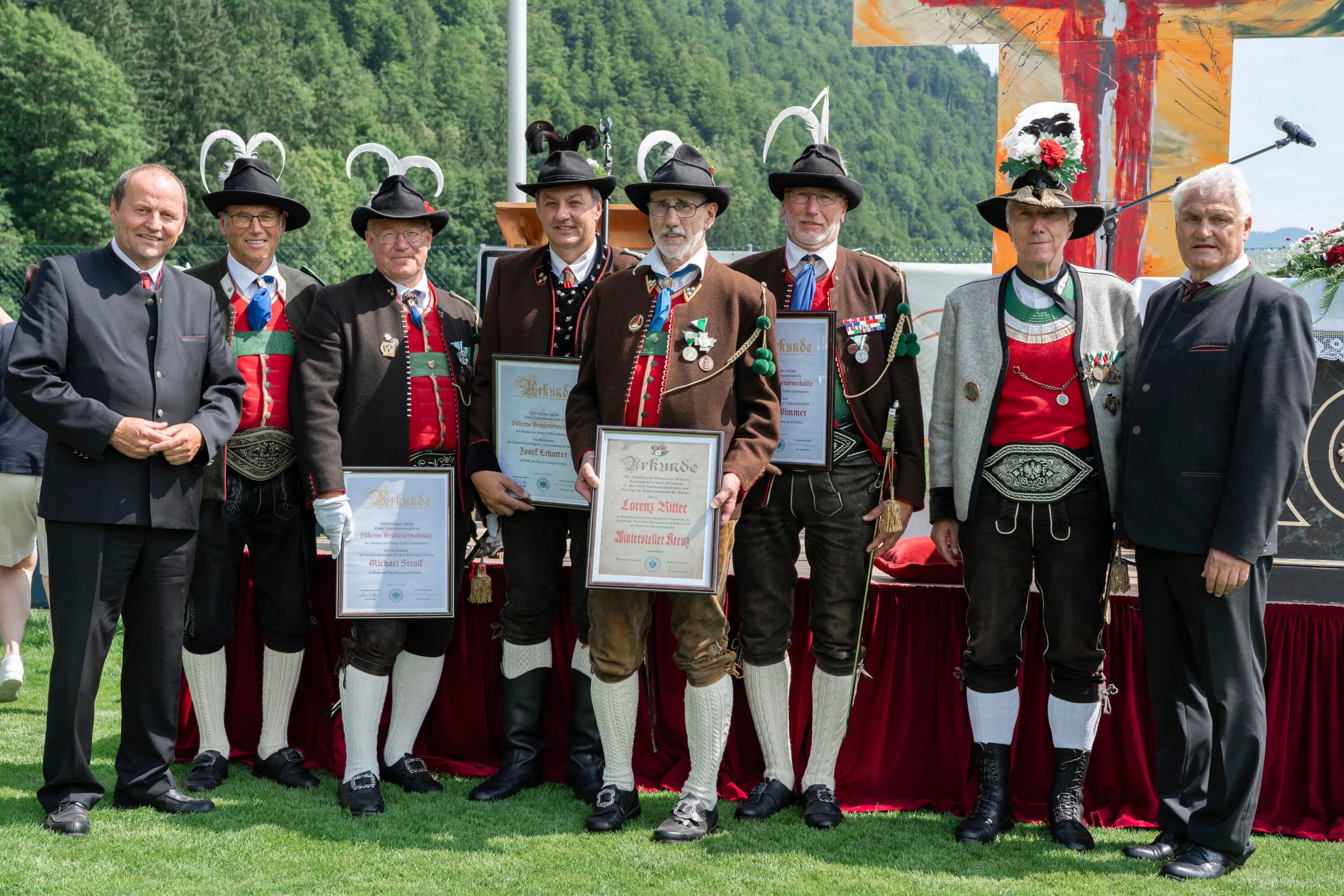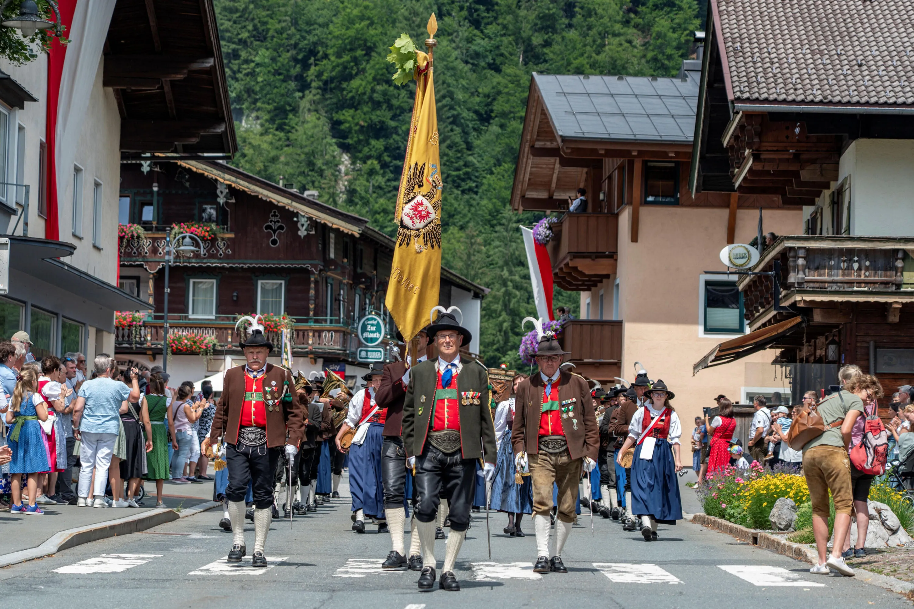 Am Sonntag hatten die Schützen ihren großen Auftritt. Mitglieder aller 16 Kompanien aus dem Bezirk nahmen am Fußballplatz Aufstellung – mit dabei als Ehrenkompanie die Scharfschützenkompanie Wildschönau, weiters die Kompanien aus Thiersee, Uderns und Lofer. Der Festakt wurde von den Musikkapellen Kirchdorf, Erpfendorf und St. Martin bei Lofer musikalisch umrahmt. Nach der feierlichen Feldmesse fand der traditionelle Festakt statt. Bataillonskommandant und als Kommandant der Kirchdorfer Rupert Wintersteller Kompanie - sozusagen als Hausherr, konnte Hans Hinterholzer zahlreiche Ehrengäste begrüßen und freute sich besonders, dass er verdiente Schützen vor den Vorhang holen konnte. Hauptmann Sepp Erharter (Hopfgarten), Hauptmann Michael Straif (Kössen) sowie Leutnant Martin Wimmer (Fieberbrunn) freuten sich über die Silberne Verdienstmedaille. Oberjäger Lorenz Ritter (St. Johann) – er hatte sich über viele Jahre für das Jungschützen Schießwesen verdient gemacht – wurde das Wintersteller – Kreuz überreicht. Es ist bereits Tradition, dass beim Bataillonsfest die Sieger des Schießbewerbes der Jungschützen die Schützenkette überreicht wird“, so Major Hinterholzer. Heuer wurde dies von Florian Kaser an Elena Achreiner (Westendorf) weitergegeben. Der Höhepunkt des Tages war aber der Schützenumzug – unter dem Beifall vieler Enheimischer, aber auch der Ehrengäste, zogen über 800 Marketenderinnen und Schützen begleitet von den Musikkapellen durch das Dorfzentrum, bevor im Zelt zünftig weitergefeiert wurde.